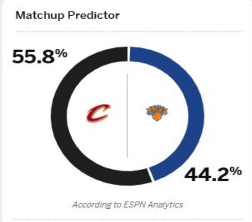 根据ESPN给出的胜率预测来看,他们更看好客场作战的骑士,骑士有55.8%的概率可以击败尼克斯。